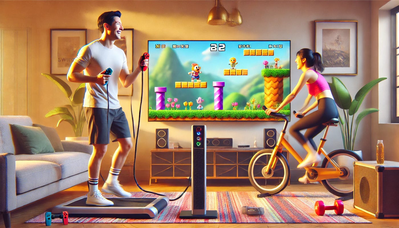 It’s pretty simple, but fun and effective: Working out while playing Super Mario on the Switch together.